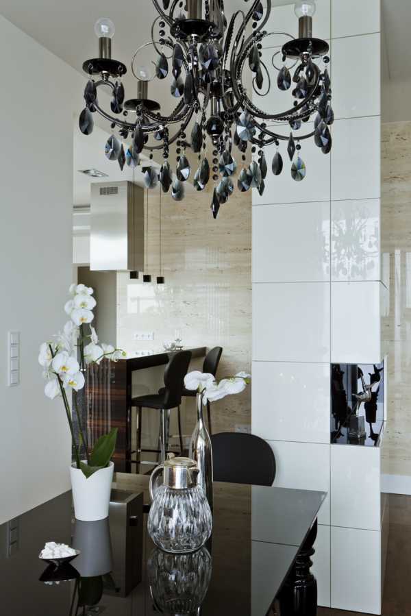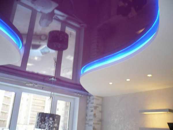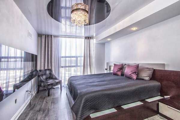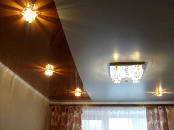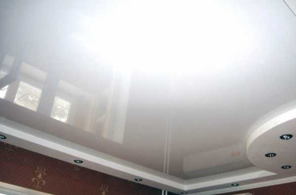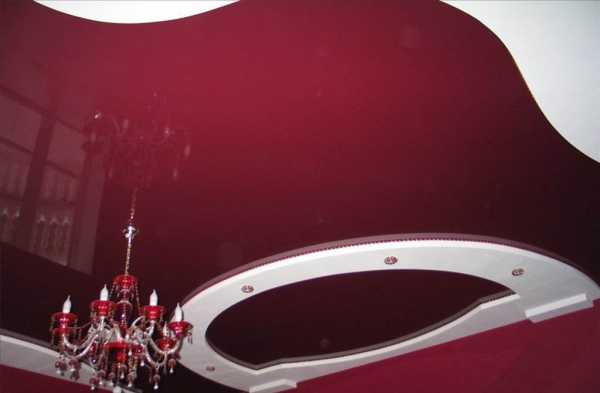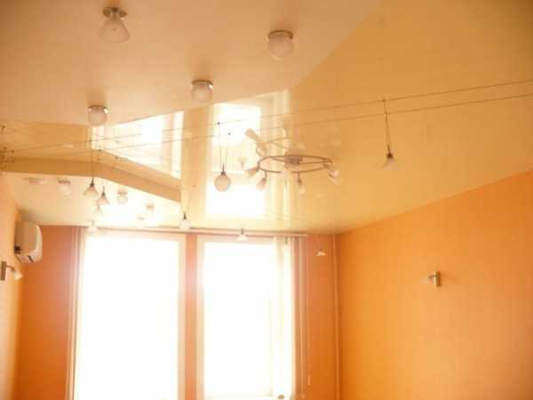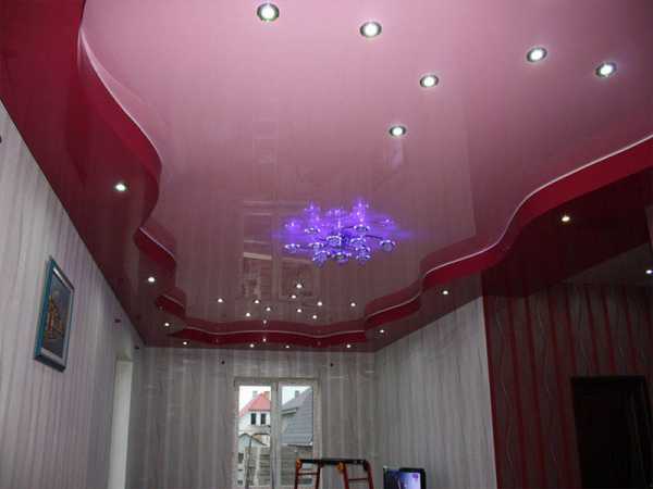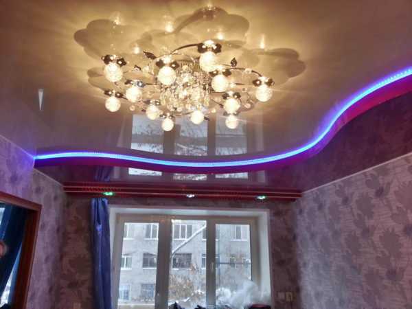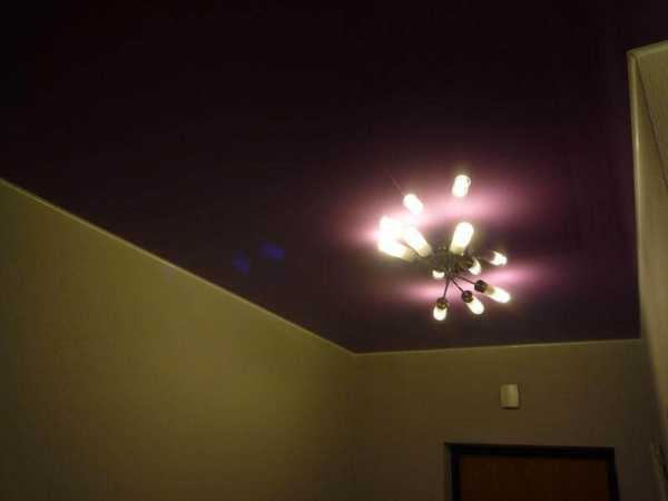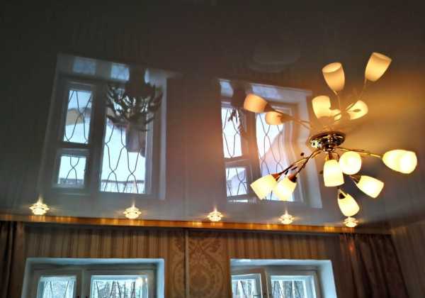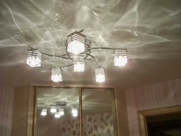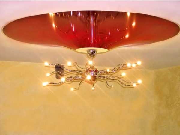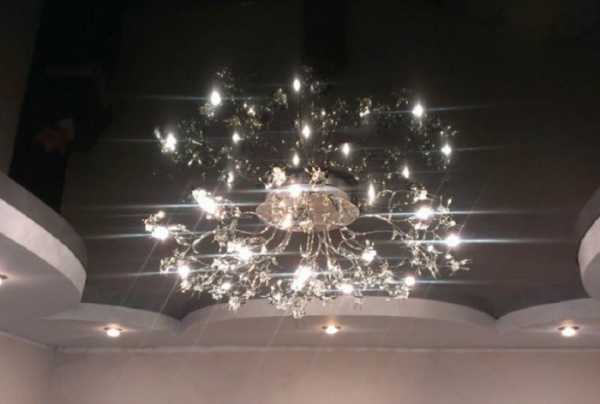 Глянцевый натяжной потолок обладает отличными зеркальными свойствами, поэтому на его плоскости будут отражаться все «внутренности люстры», поэтому стоит выбирать модели со скрытой, незаметной внутренней проводкой.
