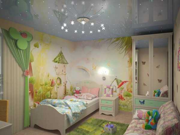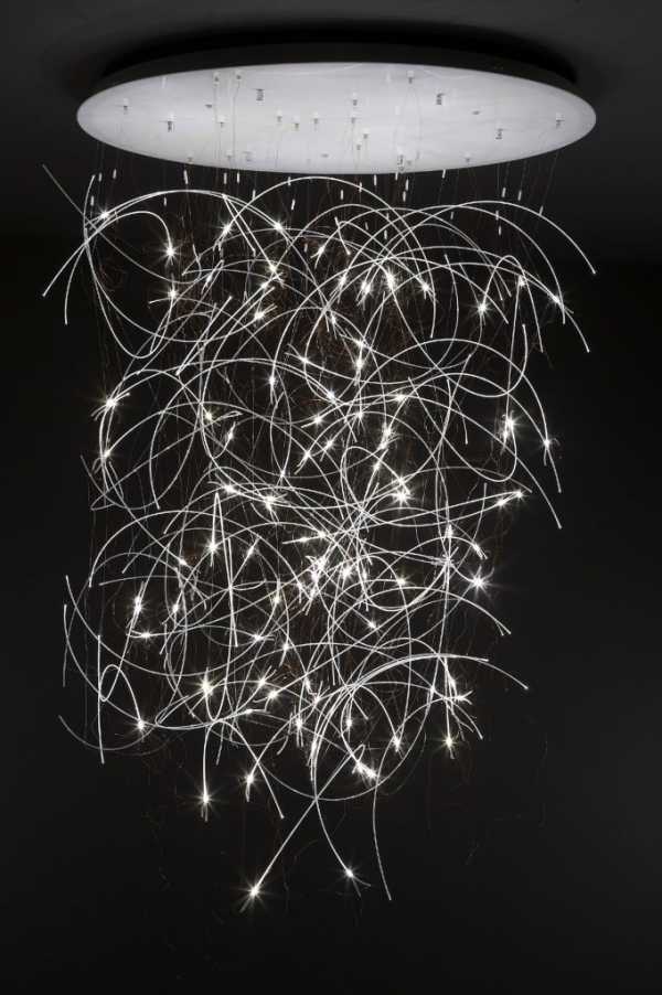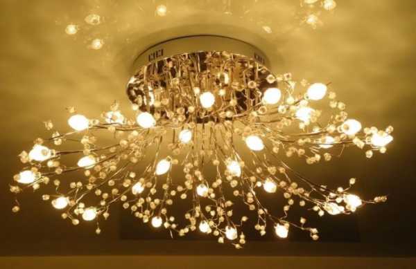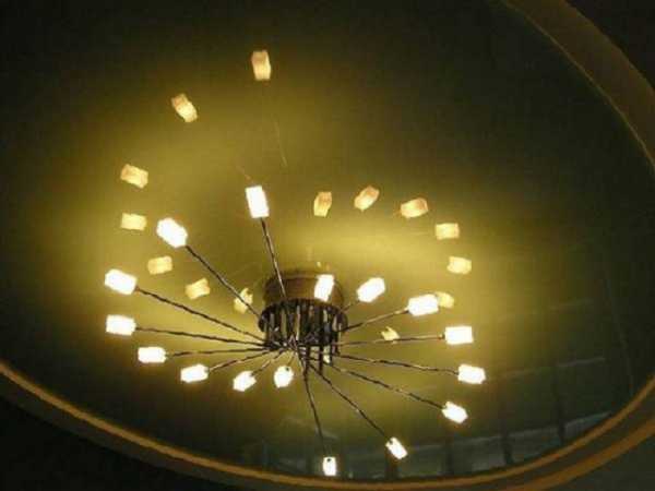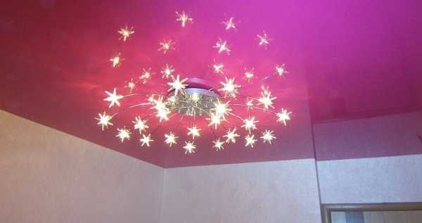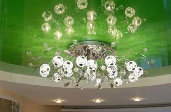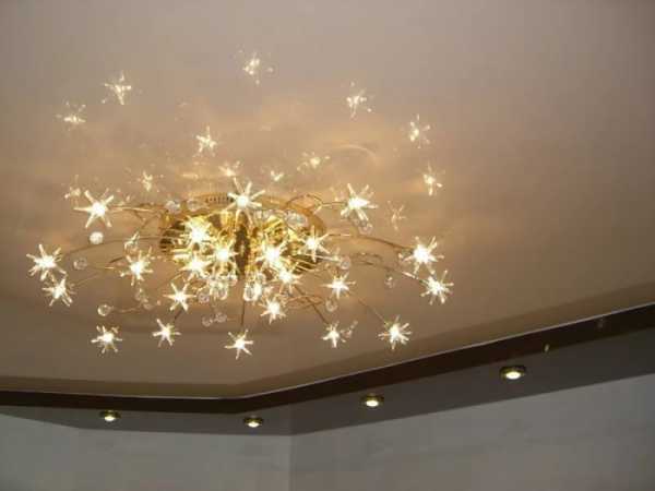 Люстра, которая имеет много маломощных лампочек, также отлично подойдет для натяжного потолка