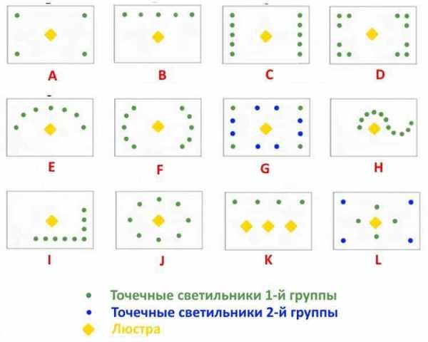 Предлагаем вам отличную схему, которая поможет правильно расставить в зале точечные светильники вокруг люстры и сделать интерьер уютнее и выразительнее.