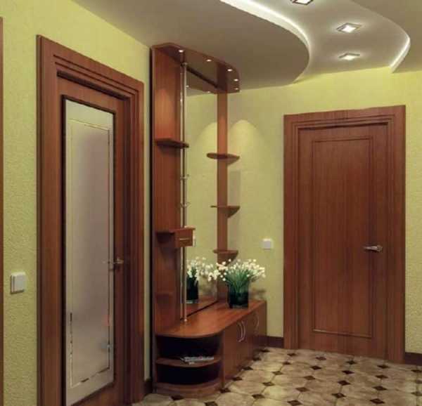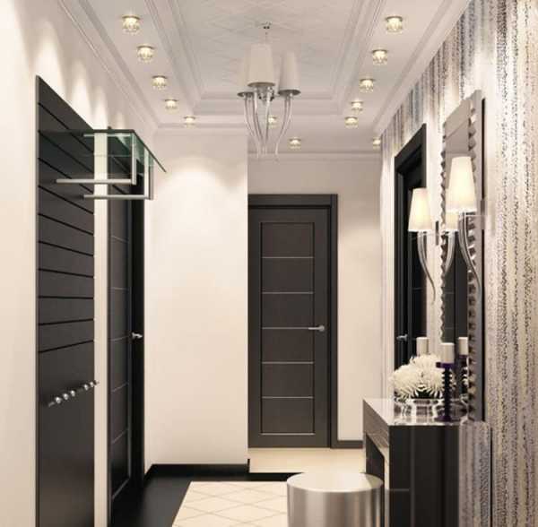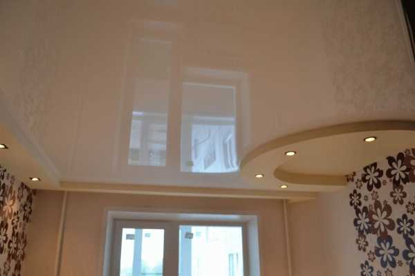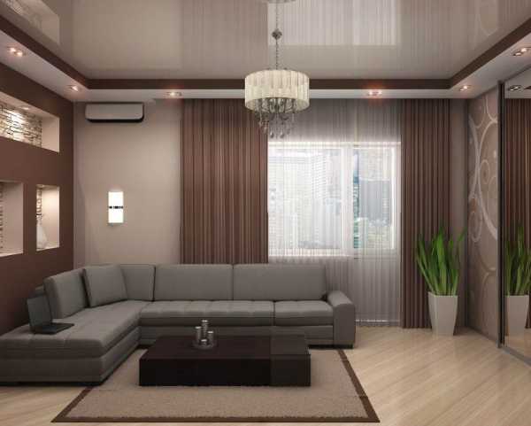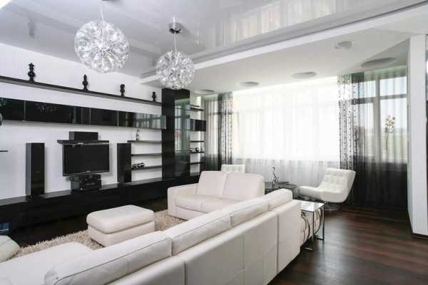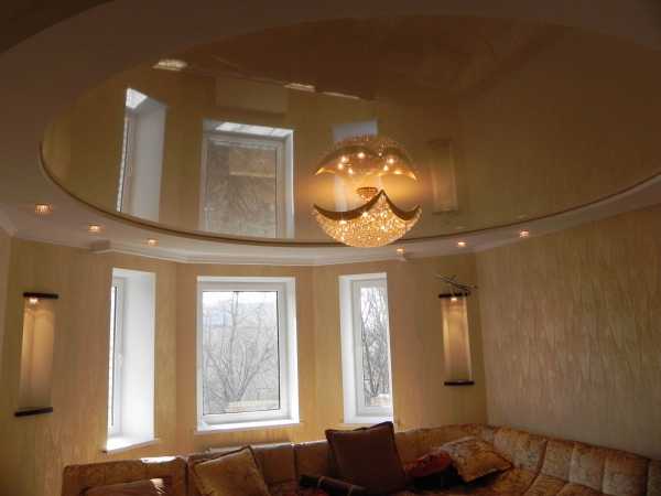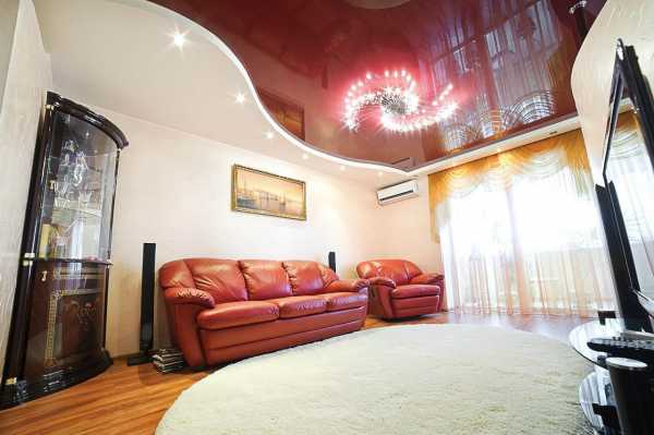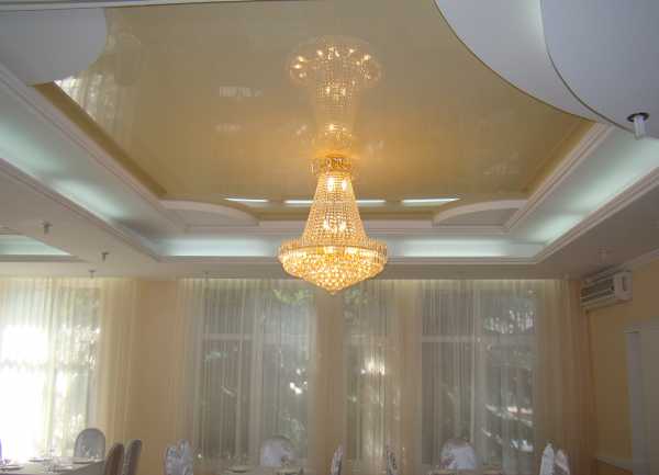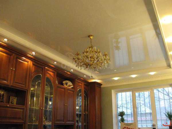 Примеры удачного использования глянцевых натяжных потолков в зале с люстрой и светильниками — на фото ниже.
