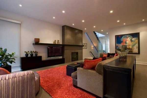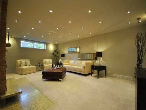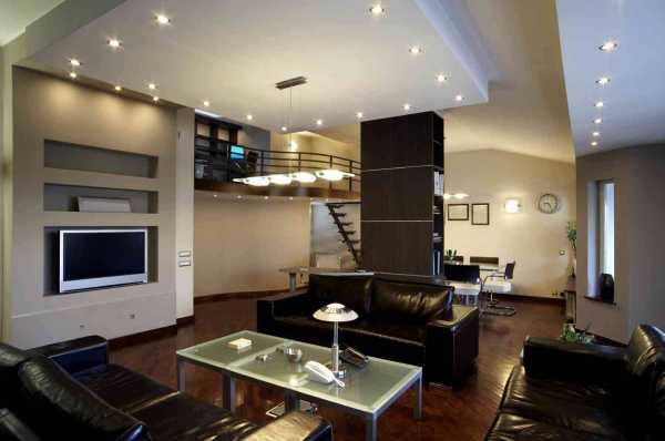 - Устанавливать в просторной гостиной исключительно точечные светильники неразумно. Их мощности может не хватить для полноценного освещения.