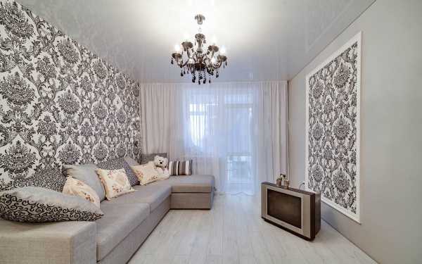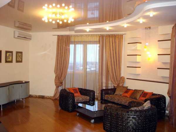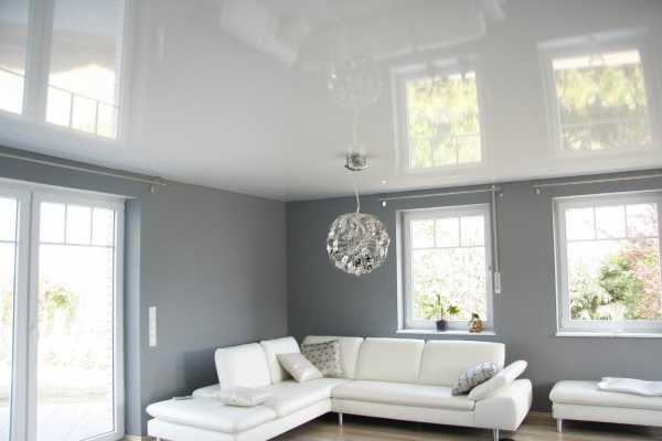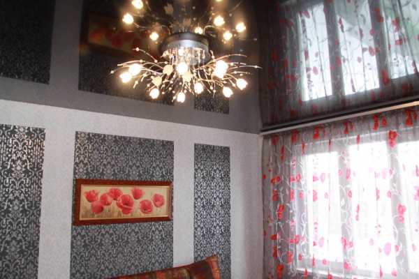 - Зеркальность глянцевых потолков представляет на всеобщее обозрение внутреннее устройство люстры гостиной. Поэтому имеет значение расположение проводки, желательно, чтобы она была скрыта и не отражалась на поверхности.
