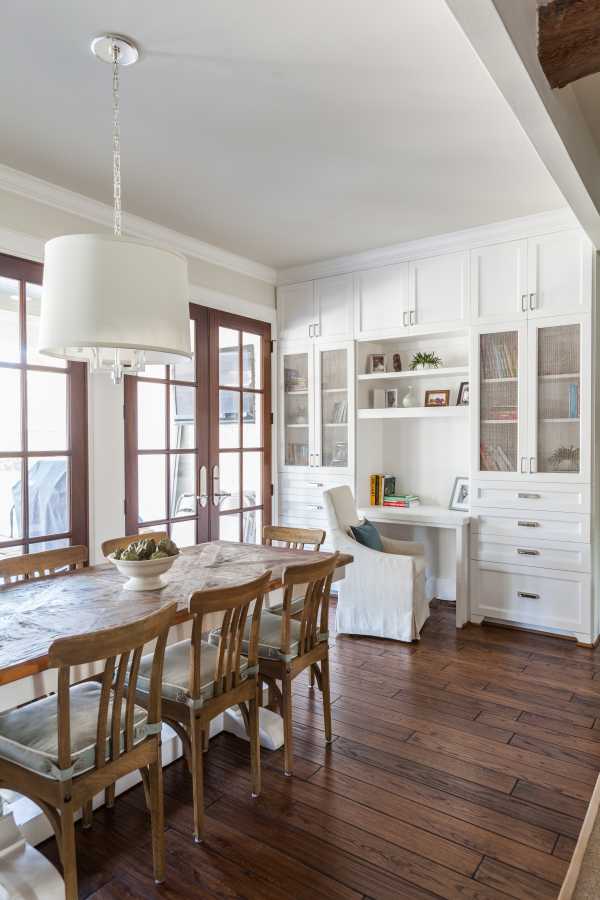 Кухонный потолок украшен небольшими люстрами с плафонами