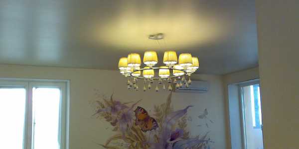 - Натяжной потолок, имея глянцевую поверхность, может отражать до 80% света, поэтому не рекомендуется покупать для освещения люстры с открытыми лампами. Лучше выбрать светильники с плафонами, чтобы они рассеивали свет, а не отражались на полотне.