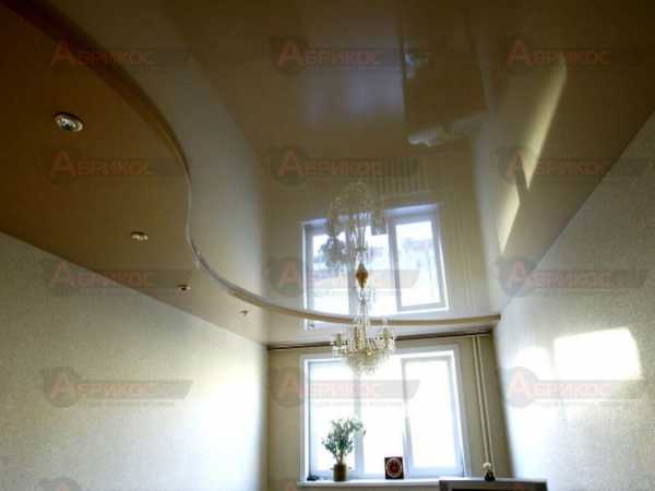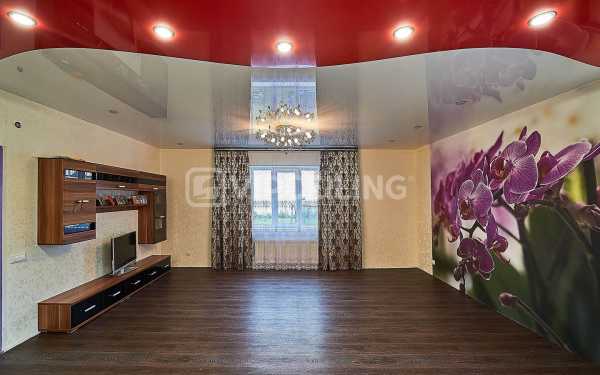 Одно из лучших решений для зала по совокупности всех своих преимуществ и отлаженной взаимосвязи с используемыми источниками света. Полотна с эффектом глянца прекрасно себя чувствуют как по соседству с классической хрустальной люстрой, так и с врезными спотами.