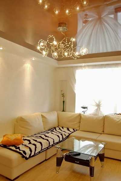 - Натяжной потолок гостиной с глянцевой поверхностью успешно отражает свет лампочек, удваивая осветительный эффект. При желании сэкономить на электропотреблении, можно подобрать конструкцию с минимальным количеством осветительных точек при условии, что световой поток из рожков будет направлен вверх. Но лампочки для таких моделей подбирают с незначительным тепловыделением, чтобы не повредить поверхность натяжного потолка.