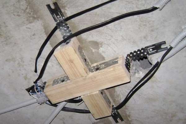 Монтажная крестообразная планка позволяет установить среднегабаритную люстру, имеющую достаточно большие пространственные размеры. При этом процесс монтажа существенно не отличается от описанного выше для монтажной платки, только вместо бруска закрепляют широкую доску (кусок фанеры) по размеру крестообразной планки. При этом пластиковые термоустойчивые кольца можно приклеить как отдельно, для каждого места крепления, так и подобрать одно большое общее. Важно, чтобы при планка плотно прилегала к потолку и из-за значительных линейных размеров крепежа не возникали перекосы и вдавливания.