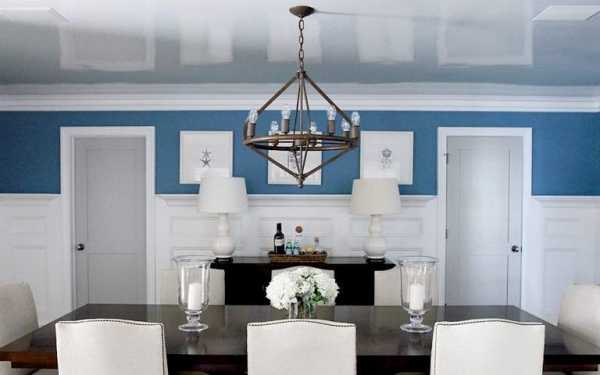 - работа на визуальное обогащение комнаты — если общее оформление зала кажется вам консервативным, однообразным и скучным, то при помощи правильно подобранного цвета на потолке можно в корне изменить впечатление от всего интерьера.
