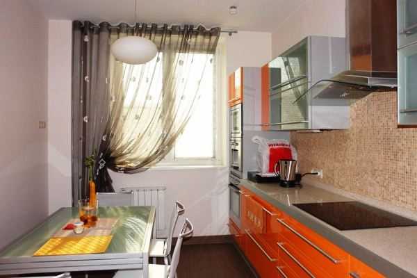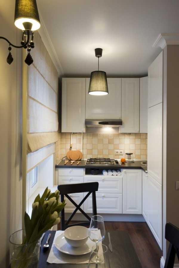Перед тем, как обустроить маленькую кухню, желательно подобрать шторы, которые будут дополнять общий дизайн. С практической стороны они защитят от яркого солнечного света и любопытных взглядов. Идеальным вариантом являются шторы, созданные из легкого и светлого материала, который пропускает в комнату максимум света. Не рекомендуется использование штор насыщенных темных тонов. Популярным решением при отделке маленькой кухни является выбор легких тканевых занавесок, декорированных римских штор и роллет.