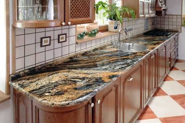 В данном помещении будет уместно смотреться мраморная плитка: она будет дополнять интерьер, к тому же материал имеет множество положительных качеств, которые особенно актуальны на кухне — это легкость в уборке и применимость для большого количества стилей.