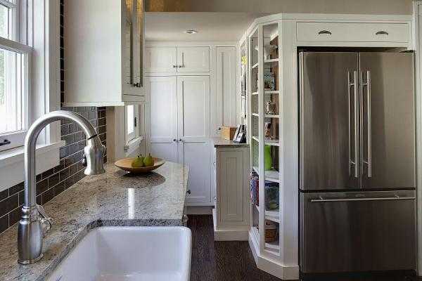Стандартная мебель не всегда позволяет поместить всю посуду и другие предметы. При нехватке свободного пространства дополнительные места можно оборудовать при помощи навесных шкафов до потолка. Оборудованная такими шкафами маленькая белая кухня будет казаться зрительно выше, если сверху установить светодиодные светильники. Напольные шкафы рекомендуется оборудовать выдвижными модулями. Для удобства размещения кухонных принадлежностей в шкафах рекомендуется организовать разделители.