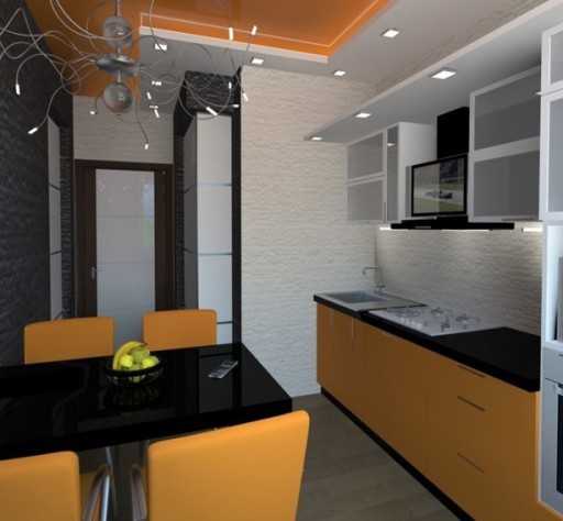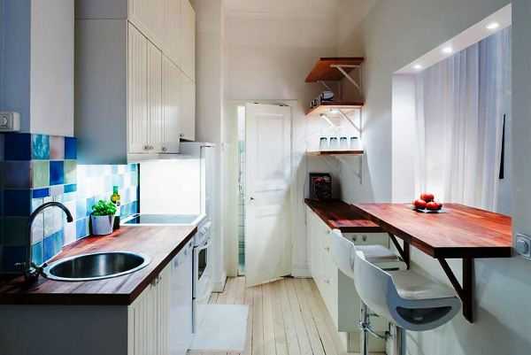 По сути, узкую кухню можно оформлять так же, как и любую другую малогабаритную. Однако тут вы уж никак не сможете поставить небольшой кухонный столик или сделать из подоконника стол. Лучше всего приобрести стол-трансформер, который вы будете поднимать и устанавливать перед едой. Он крепится к стене, и ничего сложно в том, чтобы поднять само основание стола, – нет.