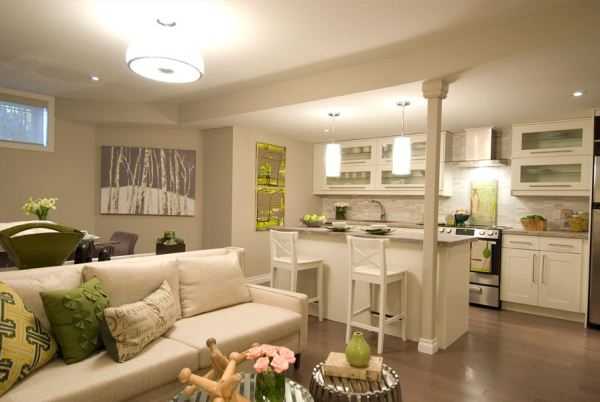 Во время создания дизайна особое внимание необходимо также уделять потолку. Ведь повышенная влажность и копоть могут безвозвратно испортить его внешний вид. При этом маленькая кухня-гостиная может быть визуально увеличена при правильном оформлении потолка, который также должен выдерживать перепады температур и противостоять воздействию влаги. Потолок отделывают с помощью пластиковых панелей или гипсокартона, часто используют натяжные полотна.