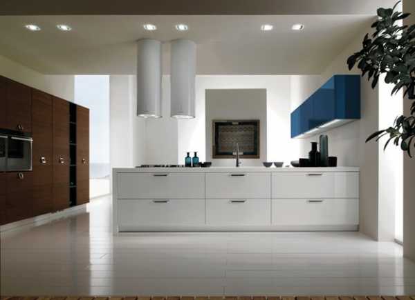 И, как в любой кухне, большое внимание уделяется правильному освещению. Здесь уместно использование направленных источников света, скрытой подсветки и даже световых штор. Светильники могут быть не только на блестящих металлических подставках и кронштейнах, но и вмонтированы прямо в мебель. Общую систему освещения прекрасно дополнят плафоны необычной формы из молочного или цветного матового стекла. Света должно быть много, поэтому на окнах могут даже отсутствовать шторы. Распределите освещение между верхним светом и интересными подсветками рабочих зон.
