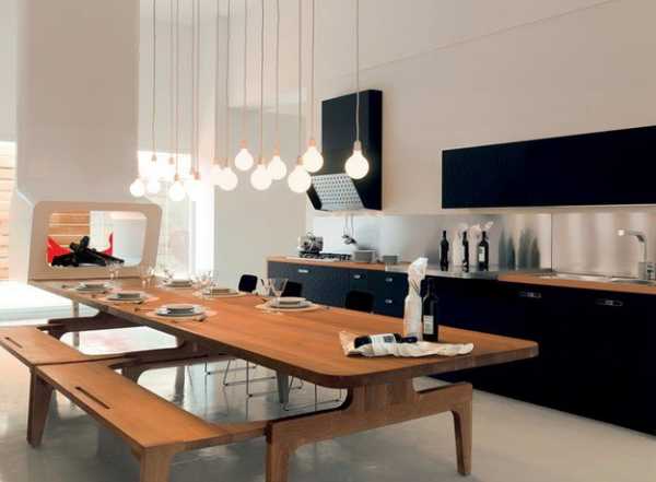Любая маленькая уютная кухня нуждается в индивидуальном освещении столовой зоны. Для этого рекомендуется использовать один большой подвесной светильник или 2 -3 маленьких, конструкции которых позволяют изменять высоту его размещения. Это дает возможность регулировать интенсивность освещения обеденной зоны. Такой вариант является эффективным с точки зрения декорирования помещения и практичным, поскольку стол будет постоянно хорошо освещен.