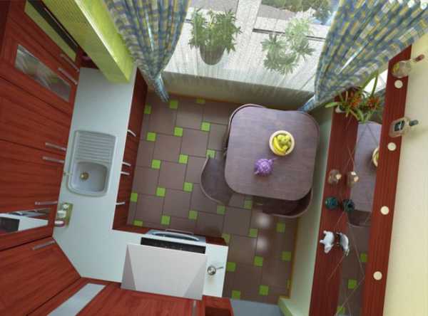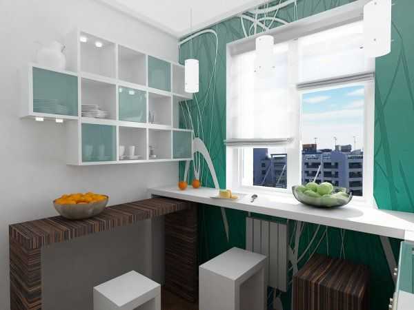 Также подоконник вы можете выполнить в качестве стола – это сэкономит место. Что касается самой мебели, предпочтение стоит отдавать Г-образной угловой мебели. Обязательно должны быть подвесные ящики, в которые можно будет сложить все кухонные принадлежности.