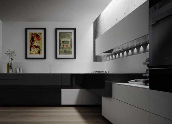 Минималистичный стиль допускает использование темных поверхностей, которые контрастируют с остальной обстановкой кухни
