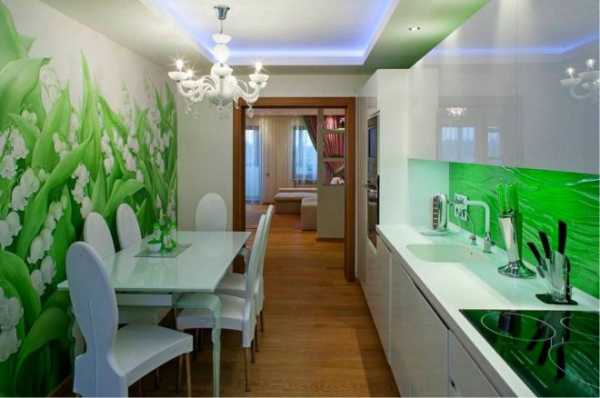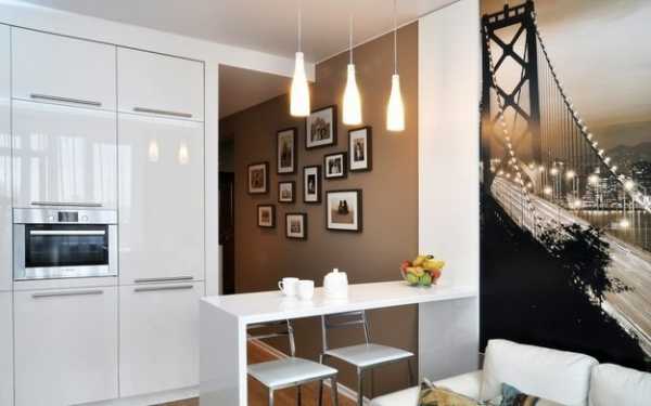 В узком помещении хорошо будут смотреться панорамные фотографии с горизонтальными линиями. Картины на них должны соответствовать размерам помещения и гармонично вписываться в пространство. С помощью фотообоев можно также отделить рабочую зону от столовой, не нарушая общую концепцию. С практичной точки зрения они должны быть влагостойкими и устойчивыми к механическим повреждениям.