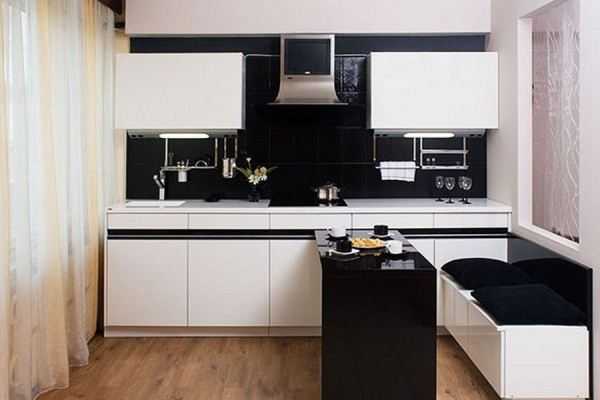 Руководствуясь современными идеями дизайна небольшой кухни, лучше всего выбирать ту мебель, которая идет по одной стене. Также стоит учитывать, что она должна быть светлого цвета. Касательно самих шкафчиков стоит отметить, что тут решать вам – нужны ли раздвигающиеся дверцы или нет. Если вам позволяет пространство, шкафчики могут быть самыми обычными.