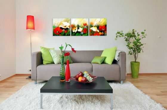 - Гостиная- место для совместного отдыха всей семьи, поэтому является полигоном для смелых экспериментов и сочетаний светлых или ярких тонов. Размеры полотна должны соотноситься с габаритами помещения. Огромные настенные композиции будут смотреться нелепо в маленькой гостиной, а небольшие изображения просто потеряются в большом пространстве.