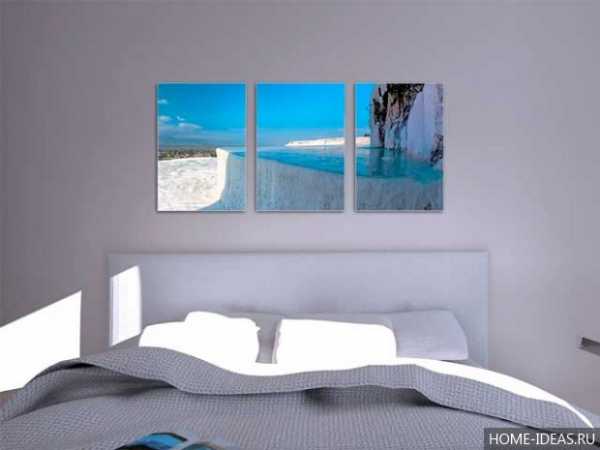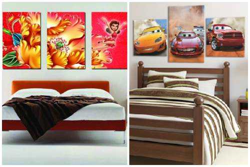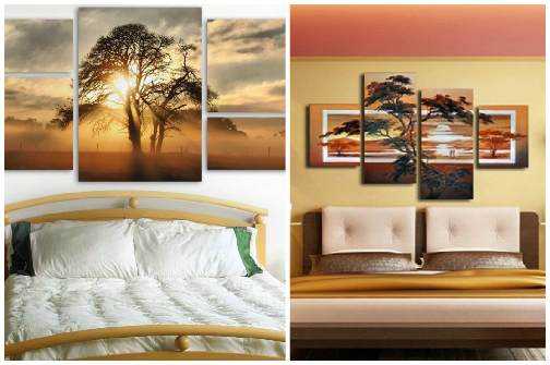 Выбирая модульную картину для спальни – остановите свой выбор на приглушенных тонах, но никак не яркие и кричащие цвета. В отношении места расположения картины на стене – тут все на ваше усмотрение. Например, если кровать стоит вдоль стены и площадь на стене над ней свободна, то картина заполнит ее. Как вариант – можно разместить картину напротив ложа и тут ее плюсом будет то, что рано утром, открыв глаза вы будете видеть собственное творение искусства, результат своих стараний, получая заряд позитива и хорошего настроения.