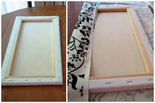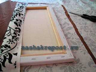 При отсутствии возможности печати какого-либо изображения и написания картин существует еще один простой, но от этого не менее выразительный способ – использование вместо холста кусков яркой узорчатой ткани. Для раскроя необходимо наложить подрамник на ткань и отрезать кусок таким образом, чтобы его края с запасом заходили на рамное основание.