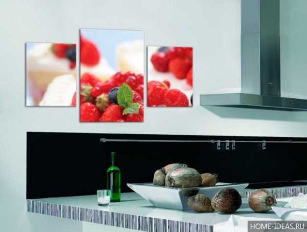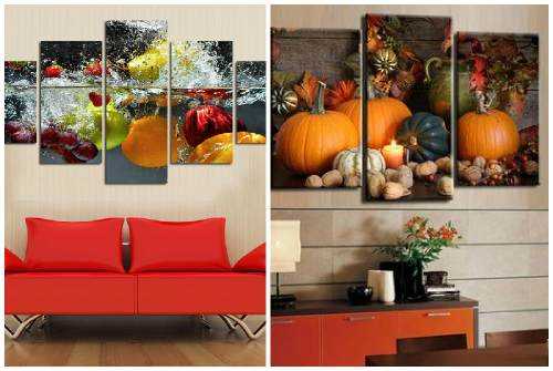 Сочно, ярко и стильно — вот идеальная комбинация для кухни. Вы можете не бояться экспериментов, но все же изображение должно сочетаться с интерьером помещения. Модульные картины для кухни лучше всего размещать на свободной стене. Если места не очень много, то лучше отказаться от декора и отдать предпочтение более функциональным полкам.