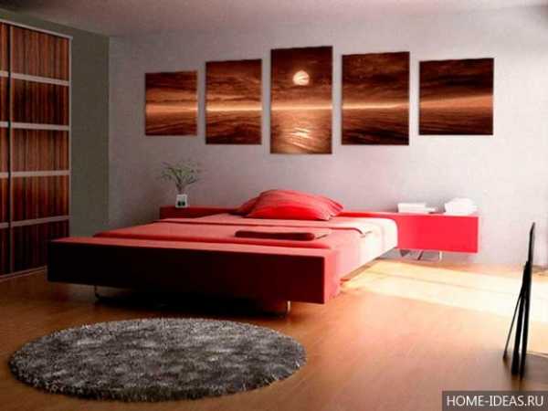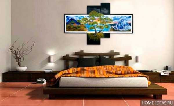 Картину для этой комнаты стоит подбирать тщательно, взвесив все «за» и «против». Отдайте предпочтение спокойным пейзажам или абстрактным изображениям. Они позволят вам отвлечься от забот, снять стресс и спокойно уснуть. Лучше всего подбирать изображение так, чтобы основные цвета пересекались с палитрой, использованной при отделке спальни. Таким образом вы сможете добиться полной гармонии и включить модульную картину в интерьер.
