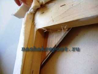 При отсутствии возможности покупки подрамников или нежелании тратить на это время и денежные средства, изготовить рамки для картин можно и самостоятельно. Для этого понадобятся рейки сечением 50×20, 40×20,50×25 миллиметров. После строгания сторон заготовок до гладкости отпилите детали равной длины попарно, запилите торцы под углом 45 градусов, и соедините на клею или скобами длиной 14 миллиметров. Для усиления угловых соединений с изнанки закрепите в каждом углу фанерные косынки – прямоугольные треугольники со сторонами 10 сантиметров.