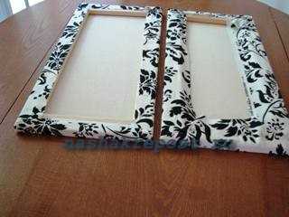 - Все вырезанные элементы из обоев разложите вниз «лицом», сверху наложите соответствующие рамки из дерева или пенопластовую основу.