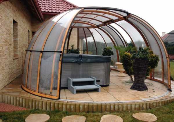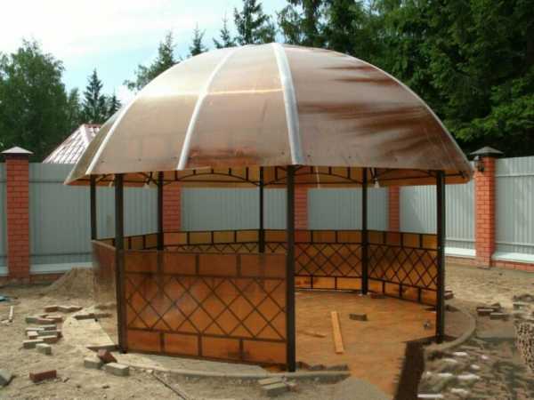 Выбор материала также зависит от формы беседки и ее крыши. Например, купольная и односкатная крыша лучше всего будет выглядеть с поликарбонатным покрытием. Поликарбонат – надежный и прочный материал, способен справится с большими температурами, имеет низкую теплопроводность и небольшой вес, не поддается влиянию солнечных лучей. Благодаря цветовому разнообразию можно подобрать материал на свой вкус, сочетающийся с любыми строительными материалами.