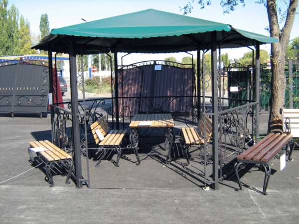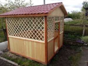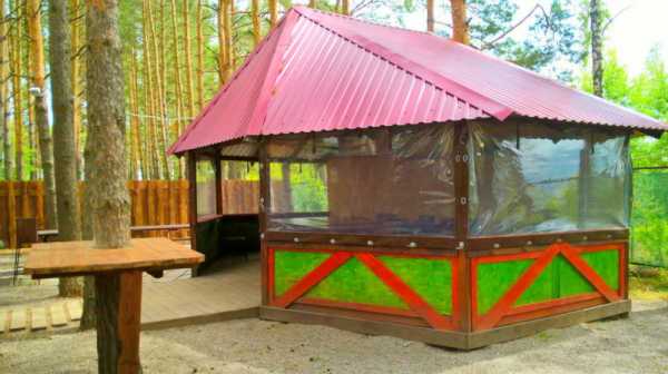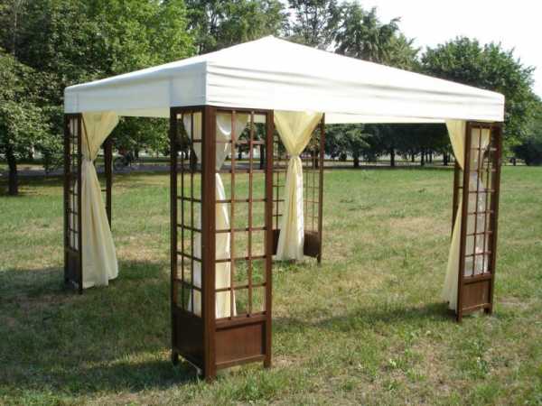 Первый вариант заранее был построен так, чтобы вся конструкция могла легко разбираться. Обычно беседки строят деревянные или металлические. Крышей служит тент, плотная пленка.