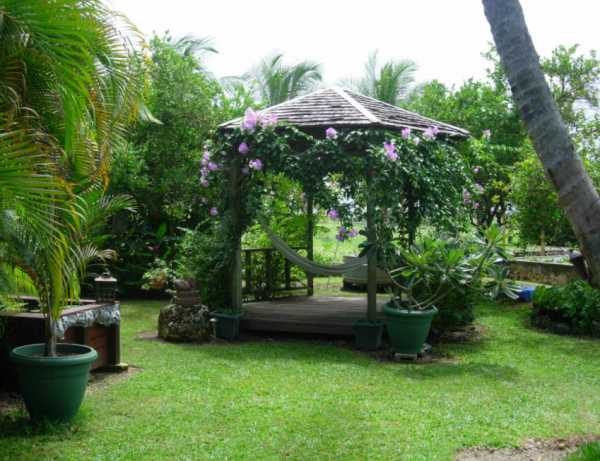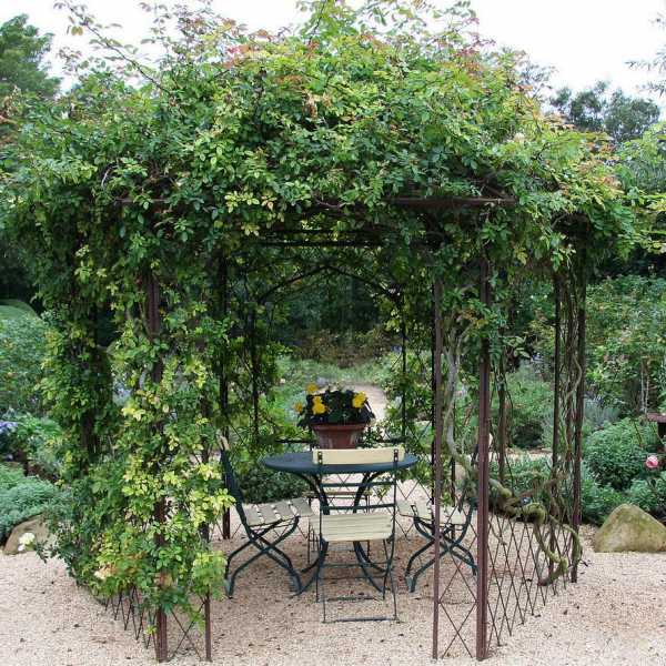 Любопытный и максимально экологичный вариант это сделать крышу беседки из живых растений. Для этого используются вьющиеся растения, которые быстро растут и накрывают беседку сплошным«живым» полотном. Более подробно про подобную растительность можно узнать в статье — Вьющиеся растения для беседки: названия, фото, варианты оформления.