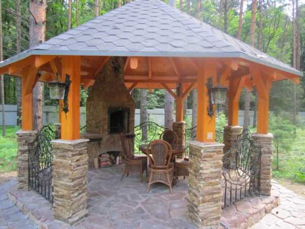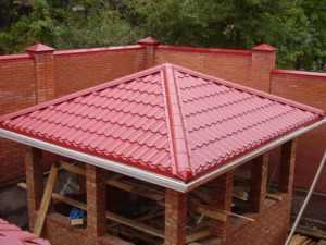 Когда в сооружениях предусмотренные мангалы, то кровля подбирается с учетом стойкости к огню. Обычно используют шифер и черепицу. Форма навеса может быть любая – это зависит от пожеланий потребителя.