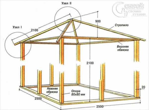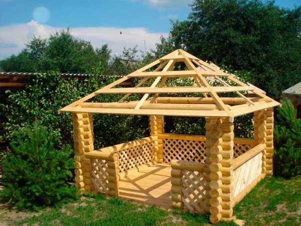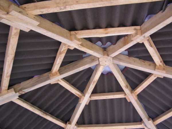 Общая статья про строительство крыши для беседки раскрывает часть вопросов. В частности, вы там найдёте чертежи и проекты готовых стропильных систем.