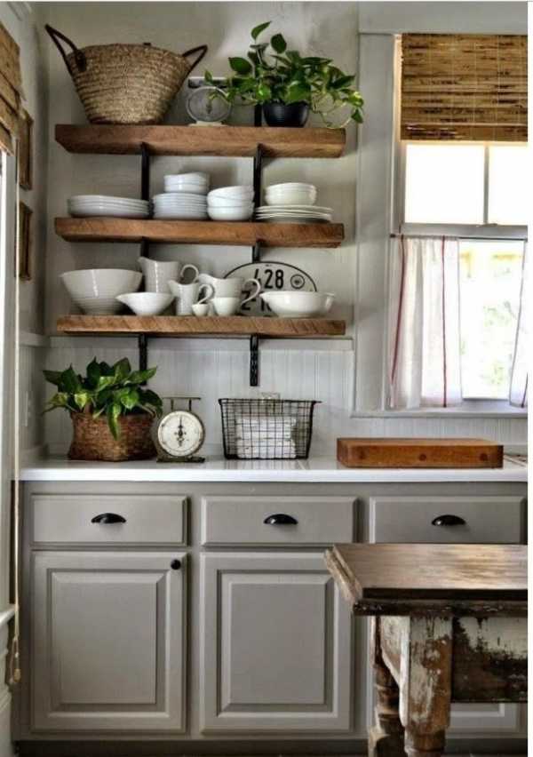 Деревянные кухонные полки отлично дополняют сельский стиль