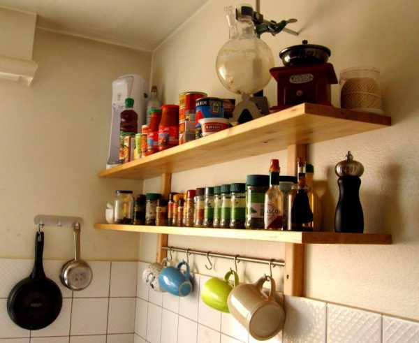 Такие полки для кухни легко смастерить самостоятельно.- Экономия места. Настенные полки на кухне позволят удобно и рационально расположить различную кухонную утварь. Это особенно важно для малогабаритных кухонь.