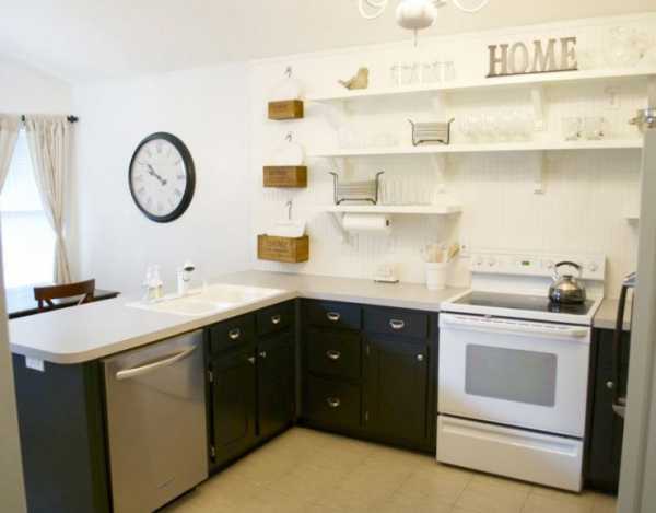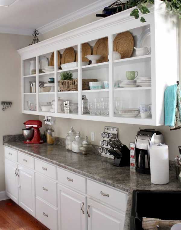 Прикрываем полочки от посторонних глаз. - Открытые полки. Чаще всего используются в декоративных целях. На них можно размещать различные элементы декора: маленькие декоративные цветы, вазочки, блюдца, фото любимых и т.д. Открытые полки на кухню красиво дополнят кухонную стену. Очень гармонично будут смотреться на большой кухне. В сети можно найти огромное количество фото кухонь с открытыми полками.
