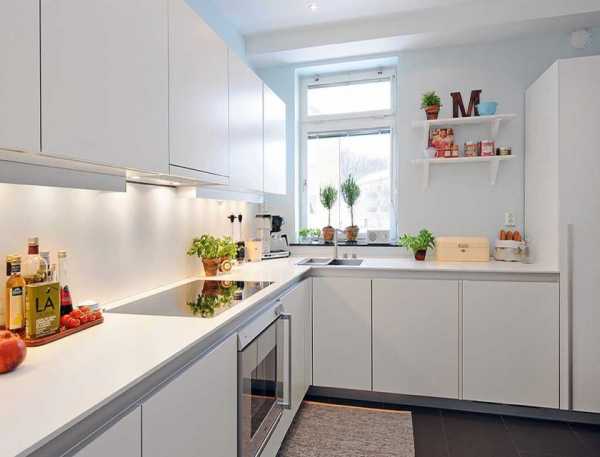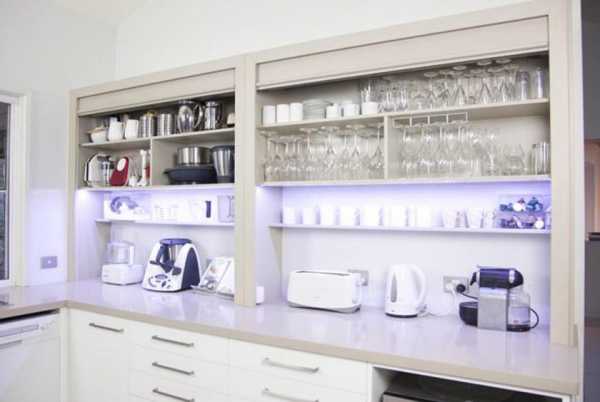 В подобных случаях посуда и быттехника скрывается в практически незаметных навесных закрытых конструкциях.