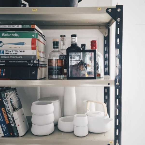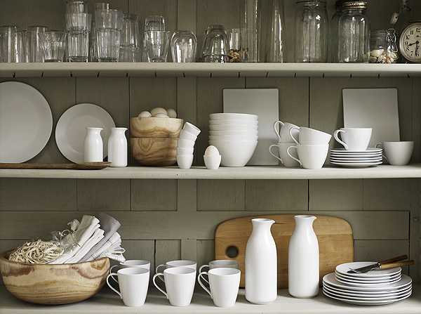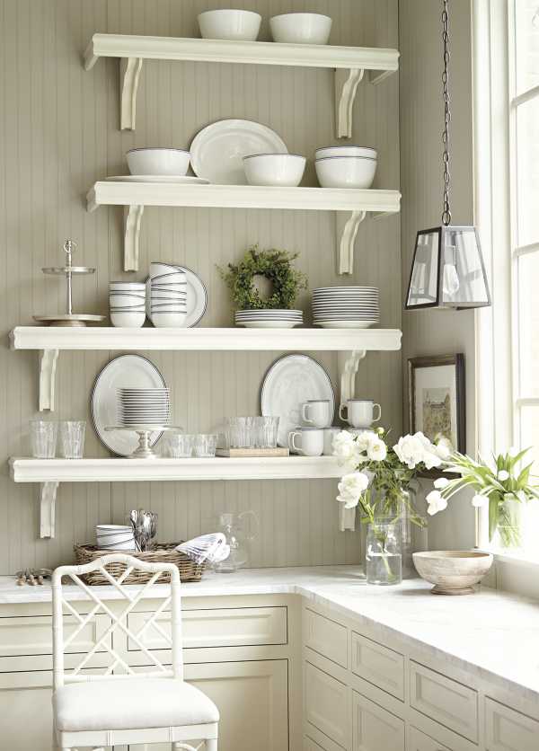 Необычную посуду великолепно подчеркнёт серый или молочный фон. А для белоснежной кухонной утвари в интерьере кухни с открытыми полками стоит выбрать кофейный фон.
