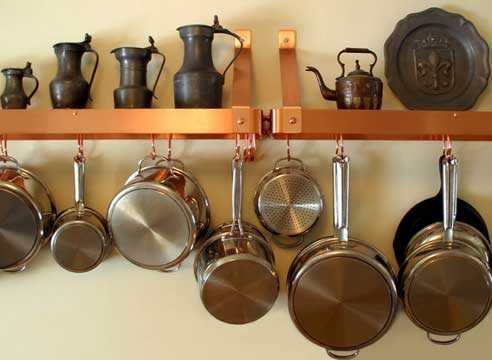 - Металлические полки на кухню. Такие полки могут крепиться как к специальным кронштейнам, так и к стенам. Очень вместительны и выдерживают значительный вес. В них можно хранить довольно весомые и габаритные кухонные агрегаты и посуду: миксеры, мясорубки, кастрюли, сковородки, различные миски. Довольно популярны кованые металлические настенные полки. Такие полки отлично впишутся в ретро-стиль. Ажурные кованые полки будут лучше смотреться в качестве декора, нежели как самостоятельный функциональный элемент. На них прекрасно будут смотреться цветочные горшки, вазы, фото членов семьи, свечи.