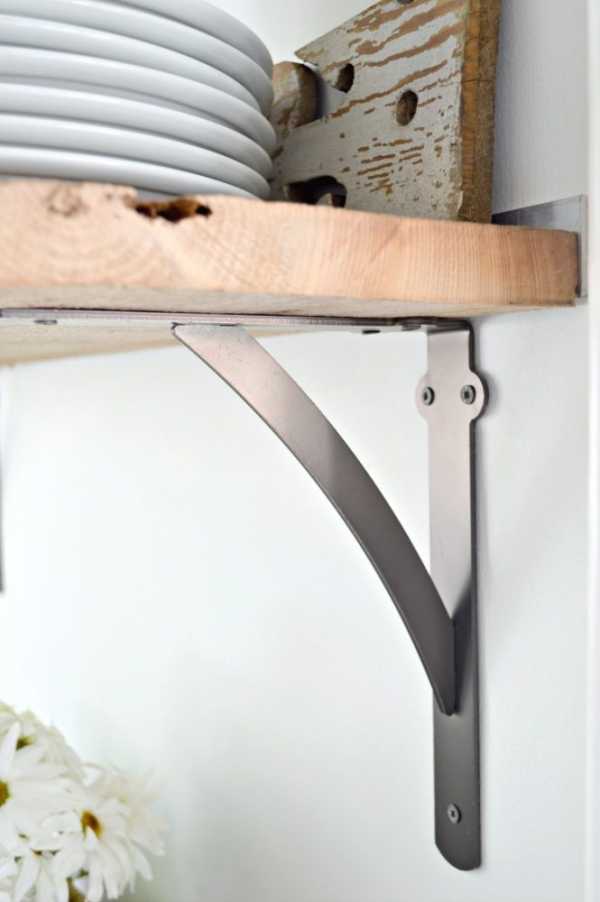 Полка для кухни может стать основным элементом декора интерьераДля использования штыря толщина полки должна быть не меньше 25мм. Штырь загоняется в стену, затем полка вплотную насаживается на штырь.