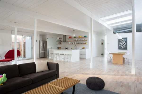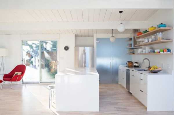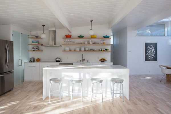 Открытые кухонные полки делают светлую кухню еще объемнее
