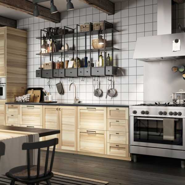 Практичным решением будет установка высокого стеллажа — от пола до крайнего уровня кухонного гарнитура. Он будет вполне живописной заменой обычному шкафу-пеналу. Чтобы знать точно, о чем идет речь, заранее рассмотрите фото.