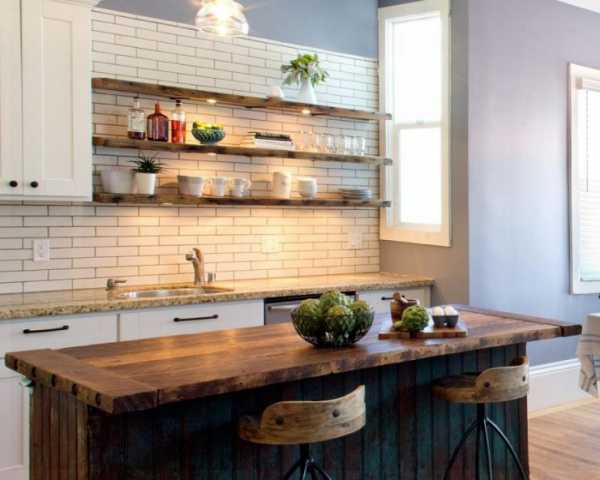 Интерьер кухни с полкамиПодобная открытая стена поможет вам сохранить место на кухне, что очень выгодно для современных малогабаритных квартир, вам не потребуется покупать большие и громоздкие навесные шкафы.