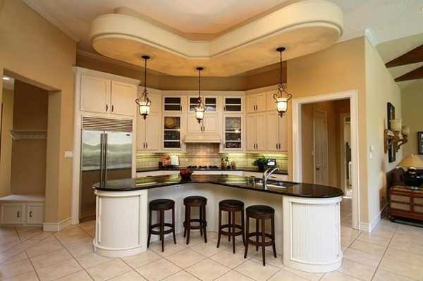 Можно посмотреть и выбрать примерный дизайн потолка на кухне, фото двухуровневых кухонных потолков.