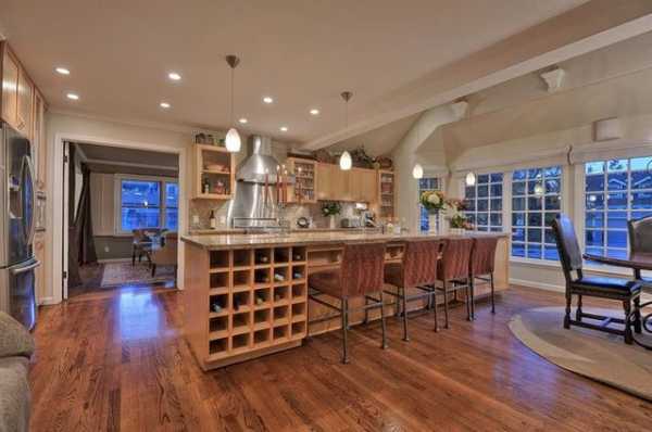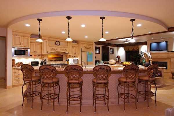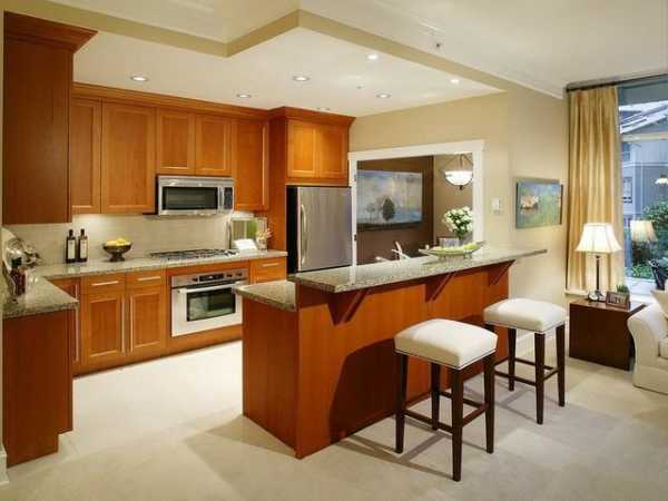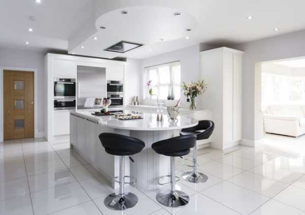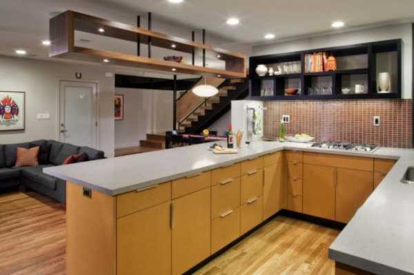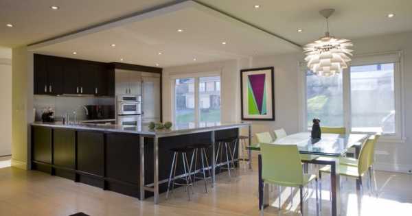 Помещение, в котором отлично раскрывает свои возможности двухуровневое исполнение – кухня, в которой, например, можно с его помощью отделить рабочие зоны кухни от зоны отдыха или акцентировать обеденный уголок.