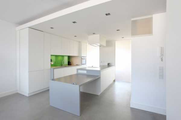На маленьких по площади кухнях такое покрытие расширит границы помещения своей идеальной чистотой, сделает помещение светлее. Глянцевыйы вариант с зеркальным эффектом визуально приподнимает потолок и рекомендуются для кухонь с низкой высотой помещения. Несмотря на то, что для установки требуется 2-3 см высоты, эффект увеличения высоты возникает благодаря идеально ровной и безупречно чистой поверхности.