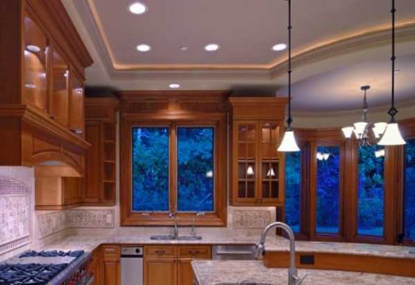 Атмосфера на кухне может кардинально меняться с помощью встроенного освещения. Например, когда в разные уровни встраиваются разнохарактерные светильники, можно добиться от одного уровня праздничного освещения, а от другого интимности. Большая часть таких решений в России создана из натяжных конструкций, потому что они просты в монтаже, удобны в эксплуатации, долговечны, имеют огромное количество вариантов художественного оформления.