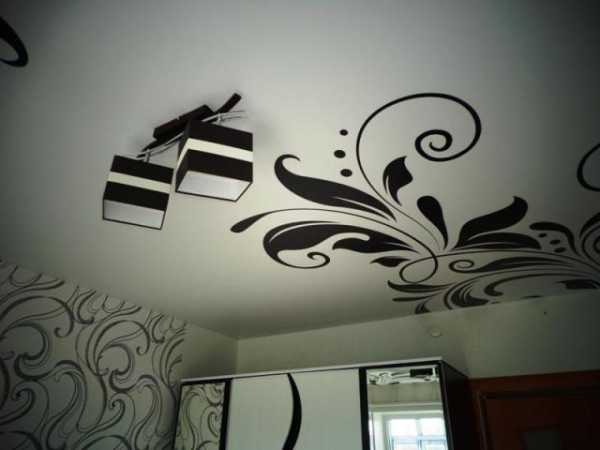 - Современное направление – тексты, символы, вензеля и иероглифы. Хорошо сочетаются с интерьерами в черном и белом цвете, причем знаки могут быть как черные на белом фоне, так и белые на черном фоне потолка. С подсветкой такой вариант смотрится довольно интересно.